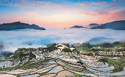春來(lái)水滿(mǎn)田疇,如串串銀鏈掛山間;夏至佳禾吐翠,似層層綠浪排蒼穹;金秋,稻穗沉甸,像座座金塔頂玉宇;隆冬,雪兆豐年,若環(huán)環(huán)白玉砌云端。