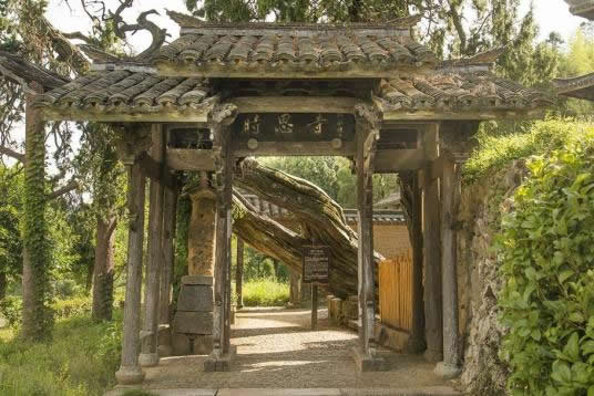 進(jìn)了山門,邁上幾級臺階,有一個(gè)黃土砂礫鋪筑的小天地,右側(cè)有石臺階,通向枝桿蒼虬的柳杉王;左側(cè)是下坡道,通向時(shí)思寺的鐘樓與大殿;迎面是一堵砂石黃泥壘筑的儀門,通向梅氏宗祠。