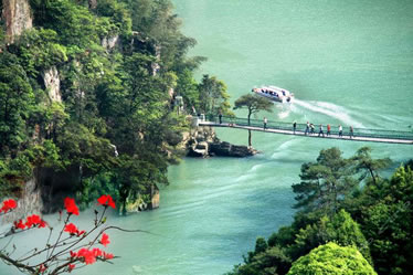 過龍?zhí),潭水平和,為峽谷漂流的登筏之處;懸空橋由鋼索懸架而成,長近70米,高逾40米,上橋行走,凌空晃蕩,不少游客會為之發(fā)怵心顫,給人以無窮刺激,有人稱之為“勇敢者橋”。五星橋頭設(shè)有山貨市場,可供應(yīng)大峽谷內(nèi)的各種特產(chǎn)。